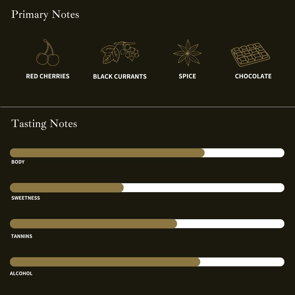 This wine reveals notes of blueberries, blackcurrants, and a hint of pepper. With a medium body, it boasts flavors of red cherries, black currants, chocolate, and spice. It's a wine that coats your mouth with its elegant tannins. enticing your senses.